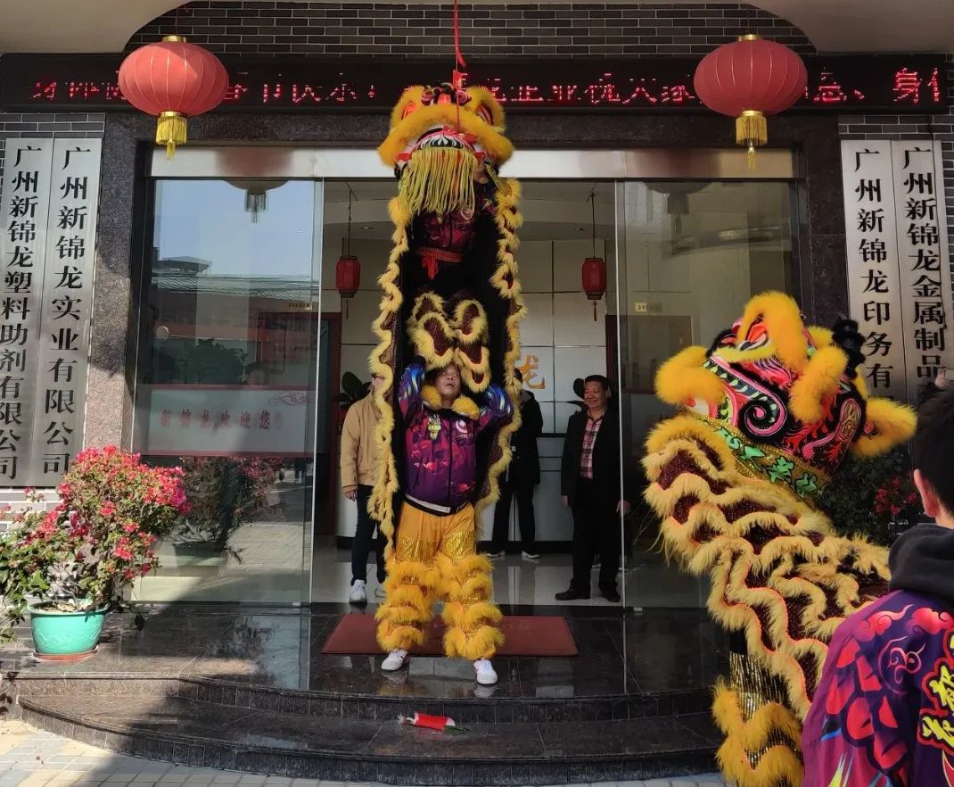 以往我们新锦龙都会在新年开工这天进行舞狮采青的活动,今天我们延续开门大吉的传统,邀请了二十多人壮大的大华村舞狮团队(二十几年合作,一直是新锦龙赞助的舞狮队),在早上9:30进行舞狮采青活动。全体员工齐聚一堂,舞狮队高举着队旗敲锣打鼓,舞狮助庆。